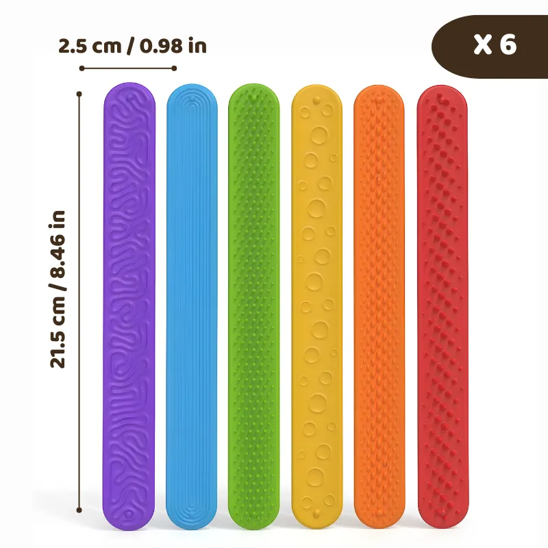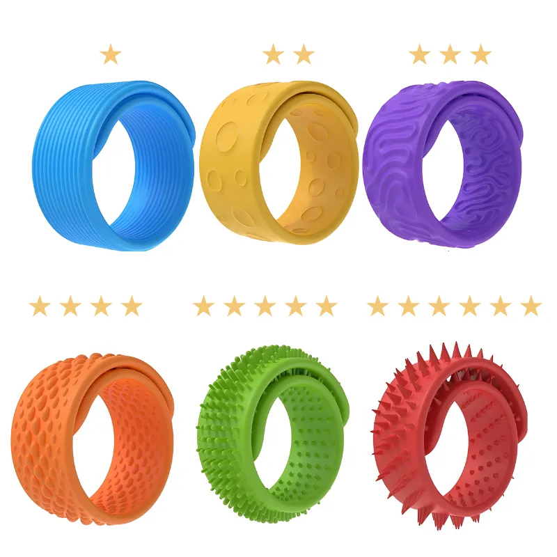 Unterstützen Sie ganz einfach die Konzentration Ihres Kindes, wo immer es hingeht. Diese farbenfrohen Silikonbänder bieten unruhigen Händen eine angenehme, beruhigende Haptik. Jedes flexible Stück hat ein einzigartiges Muster für ein wunderbares sensorisches Erlebnis. Einfach zu tragen und sicher für den täglichen Gebrauch, helfen sie Kindern, sich in geschäftigen Momenten wohlzufühlen.