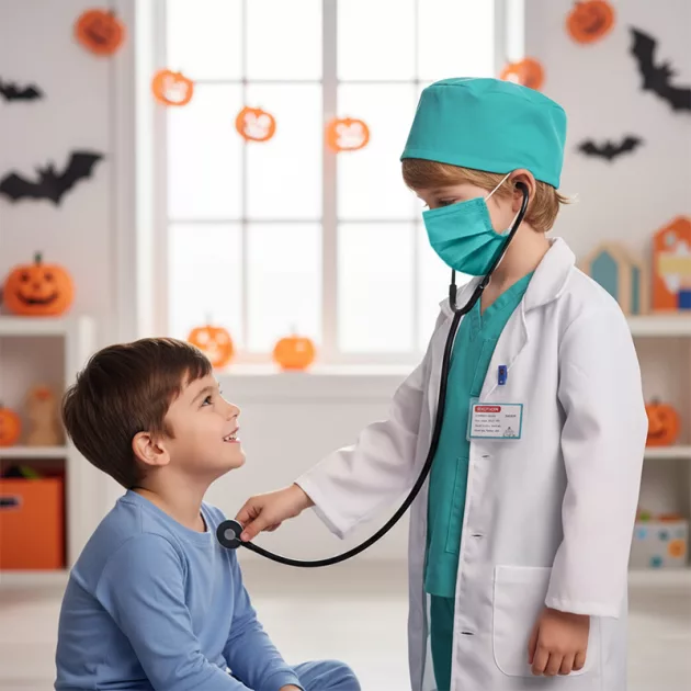 Mein Sohn hat tatsächlich etwas darüber gelernt, was Ärzte tun, als er das Kostüm getragen hat. Er hört jeden Tag das Herz seines Teddybären ab!
