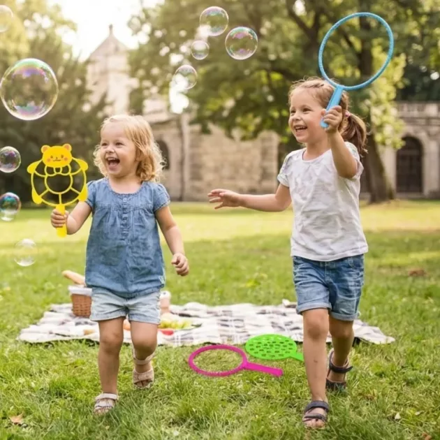 Fördert aktive Spielfreude - Spiele werden spannend, wenn überall bunte Seifenblasen schweben. Die Aufregung wächst, wenn kleine Hände Zauberstäbe schwingen und schillernden Formen nachjagen.