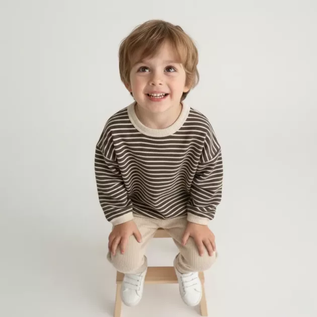 Weiche Baumwolle sorgt für ein angenehmes Hautgefühl beim Spielen und Ausruhen. Sanfte Streifen schaffen einen charmanten Alltagslook. Hochwertiger Stoff lässt sich leicht waschen und die Farben bleiben länger erhalten. Das Anziehen macht kleinen Kindern Spaß und geht ganz einfach.