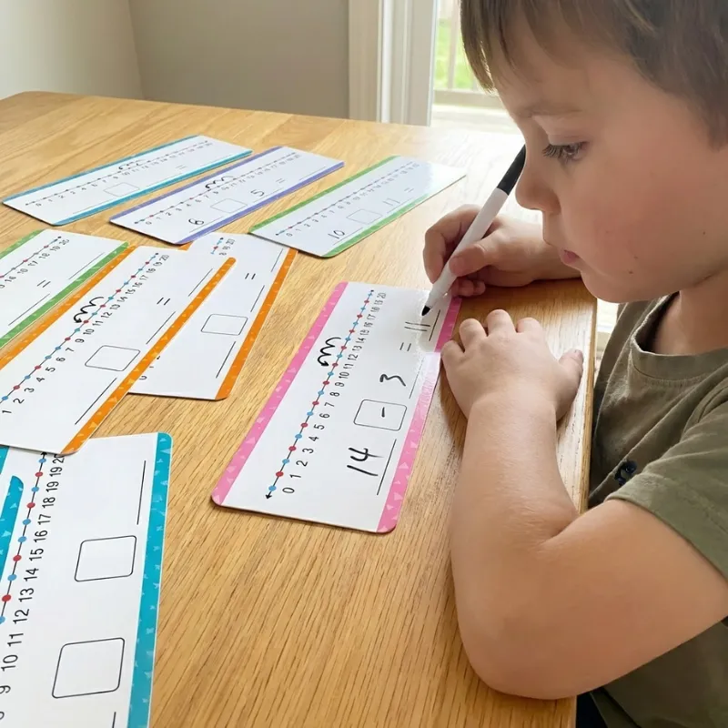 Wir bewahren das Mathe‑Set auf dem Küchentisch auf. Nach dem Abendessen suchen sich die Kinder jeweils eine Karte aus, lösen die Aufgaben, wischen sie sauber und prahlen mit ihren Ergebnissen.