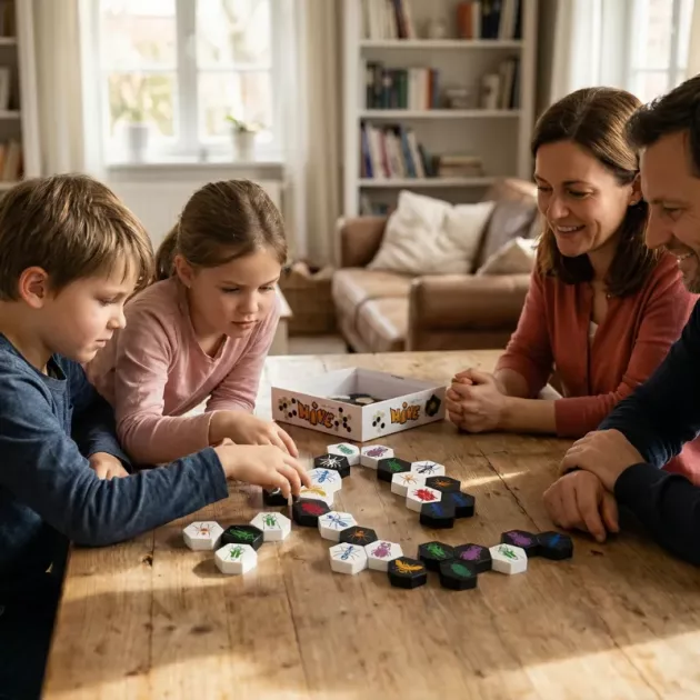Hive bringt unsere ganze Familie ins Gespräch und wir denken laut gemeinsam nach. Das Spiel bringt alle ohne Bildschirme zusammen.