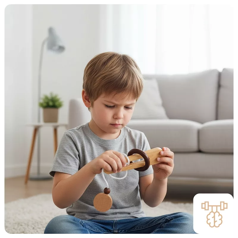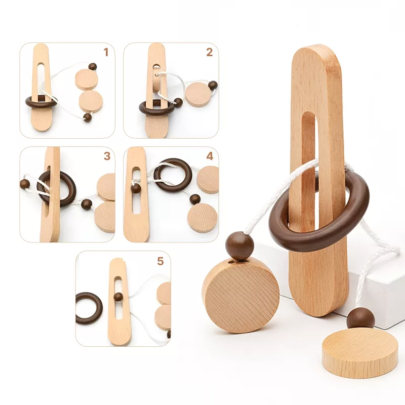 Mein Cousin hat mit diesem Holzpuzzle Geduld gelernt. Er nimmt sich Zeit und zeigt stolz, wie er es ganz allein gelöst hat.